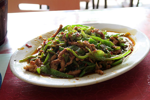 カウンターで筆談で尋ねてみると次のバスは13:30ということで1時間以上あるので切符を購入し目の前の食堂で青椒肉絲の昼飯(青椒肉絲とビール2で70RMB)。