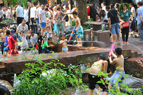 するとそこにはソンクランに使われるような圧縮式の強力な水鉄砲を手にしてバトルをしている子供達が多数。