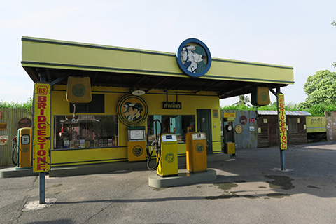 その左には黄色いガソリンスタンド。