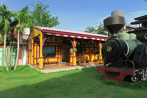 右に進んで行くとこちらも黄色い駅舎と蒸気機関車。