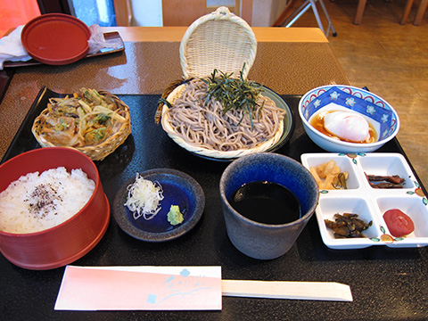 ざるそば、掻き揚げ、温泉タマゴ、ご飯、漬け物のセットでざるそばはコシがあってつるつる、漬け物でもご飯が進む。