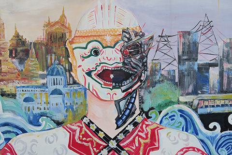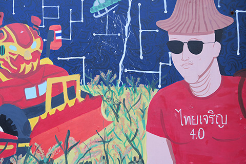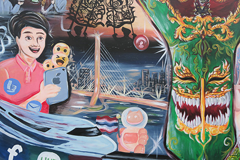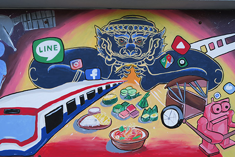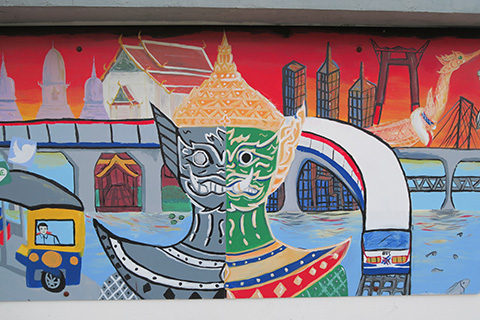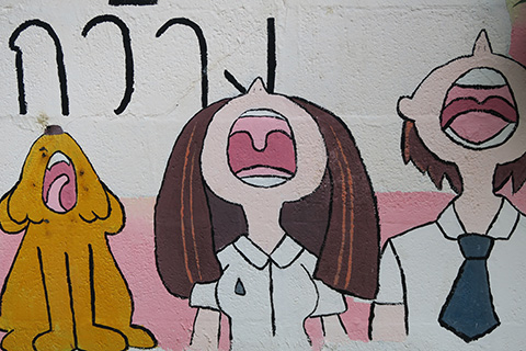 パラゴンから歩いていくとウォールペインティングはチュラ大横の歩道から始まっていた。
