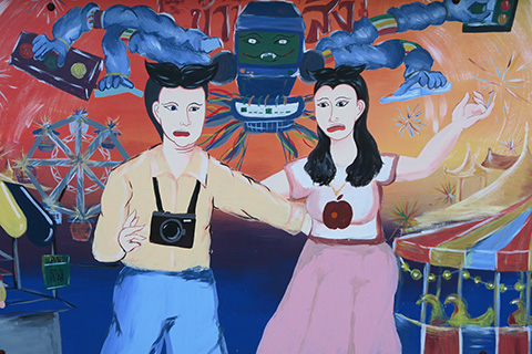 上手くはないけど題材はアニメキャラやら山岳民族、技術的には写真のような写実的なものから小学生の図画のようなものまでまちまちで面白い。
