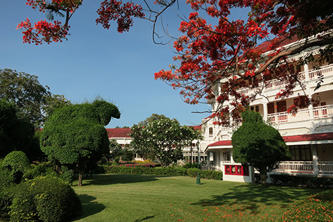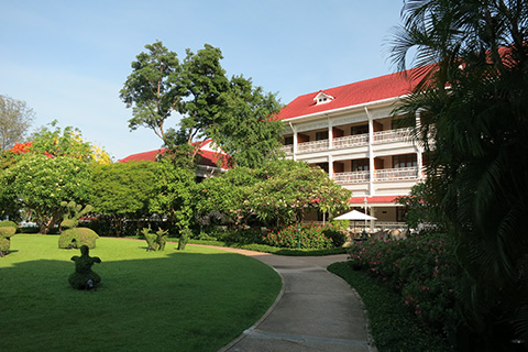 赤い屋根に白い壁、緑の豊富で広大な庭が印象的な高級ホテル。