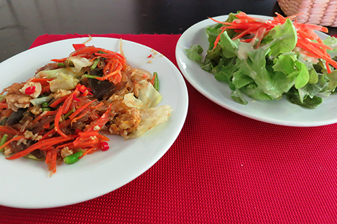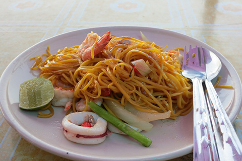 | ビーチで食べたミーパットタレー バミーを炒めたものでタイでは珍しい塩焼きそば。 美味かったけど200THBは高いよな。 |