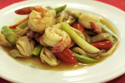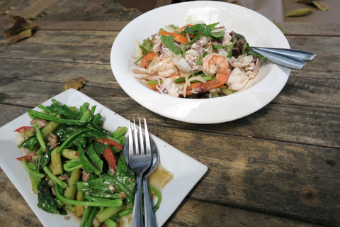 数日前から痛風が発症して、ホテルは予約してあったのにフアヒンに来るのもやめようかと思っていた膝は昨日の朝に飲んだ薬が効いたのかもう大丈夫らしかったので昼はホテルのレストランでヤムタレー(シーフードの激辛サラダ)とパッカナープラーケム(カナーという野菜と塩漬け魚の炒め物)、それにビアシン。(レバーよりはマシだけどビールもシーフードもどちらも良くない)