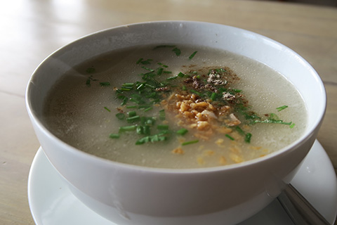 カオトムに味はほとんどないので当然可もなく不可もなく。酢漬けの唐辛子やナンプラーを垂らして食べる。