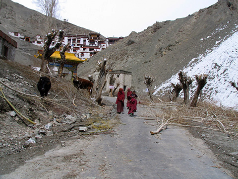 Alci同様このゴンパにも修行僧の子供たちがいて、枯れ木の向こうに学校となっているらしい建物を出入りする姿が見えていた。
