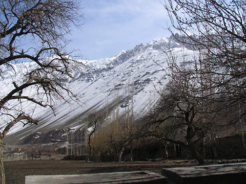 寺の裏にはインダスの清流、表には雪を被ったヒマラヤの山々、目の前には冬枯れの木々とところどころ土を見せながらもまだ雪に覆われている畑。