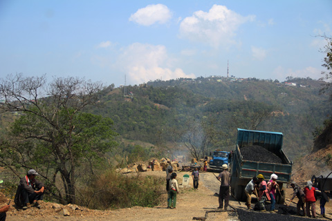 舗装率は半分以下、至る所落石あり、しばらく停車させられた舗装工事は手作業。