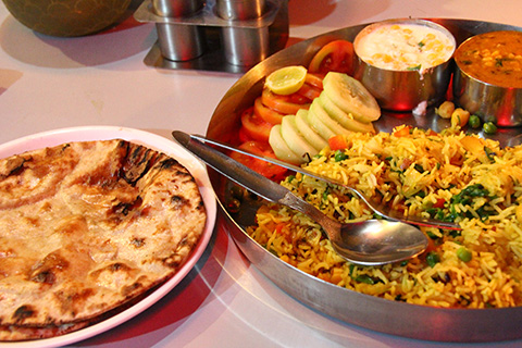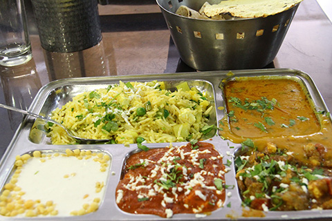 ここのターリーはプラーオ(ご飯)とダール(豆スープ)、サブジー(野菜カレー)、チャッツネ、ダヒール、チャパティにパパッドと量がかなり多め。さらにおかわり自由。