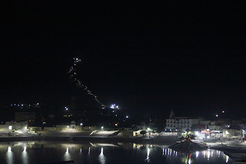 周囲を眺めると居並ぶ建物の向こうに真っ暗な湖が見える。そして左手には小高い丘に向かって一列のライト。