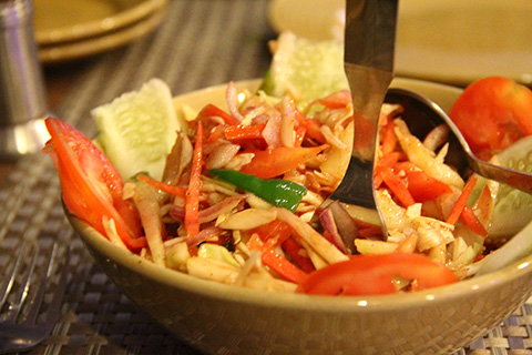 ミックスサラダはニンジンやキャベツの細切りにフォークが垂直にぶっさされていたがこれがデリー風なんだろうか。