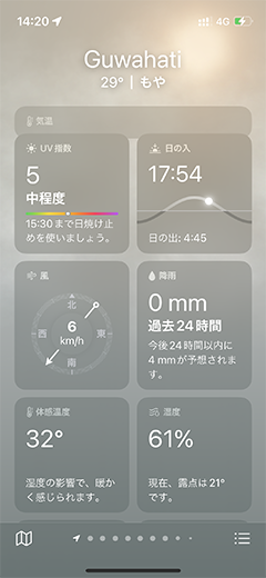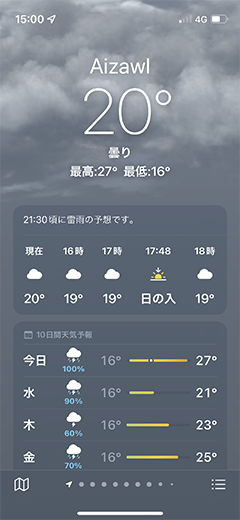 デリーはこの時期最高気温は軽く40度を超えるが、アッサム州グワハティでは最高気温が33度程度、夜間は24度、山間地のアイザワールでは夕方で20度と長袖シャツだけではちょっと肌寒く、夜は靴下をはいて寝た。