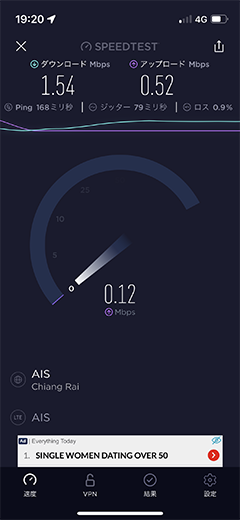 (AISエリアでの最寄り地ということかもしれないがSPEEDTESTを実行するとなぜかサーバーがチェンライになるがアイザワールにしたところで3Mbps程度)