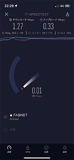ただしミゾラム州アイザワールの宿ではダウンロードが2Mbps以下、アップロードは0.5Mbps程度で激遅。