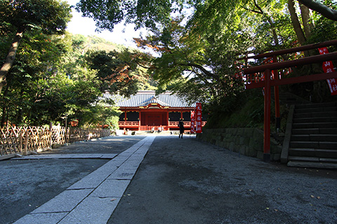 駅に向かう途中で鶴岡八幡宮の案内板を発見、裏口から入って行く。