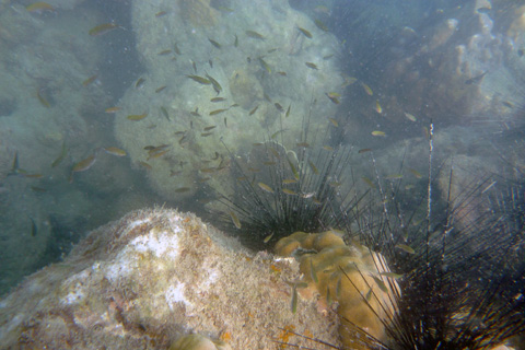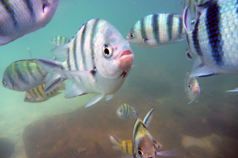それにブダイと、たまに見かける黄色と白の縞模様の魚(名前がわからないので教えて)、銀色に点々模様のゴマアイゴもチラホラ。