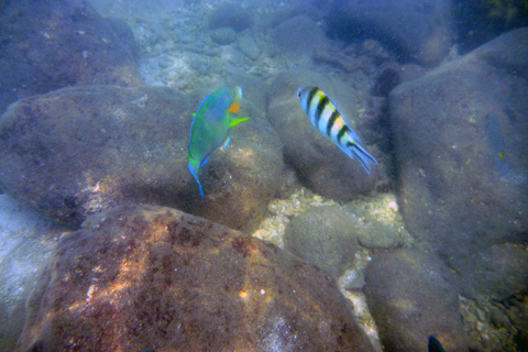 2つめの島は浮遊物が多くて透明度は高くなかったが、綺麗なルリスズメダイがそれほど深くない海底に群れでいたり、フグの一種がフラフラしていたり。
