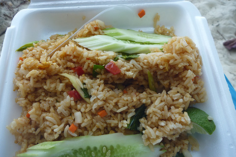 ゴ・サメットから出かけるスノーケリングツアーのゴ・クディーでのものよりはだいぶマシなカオパットとタイではたいていどこでも美味いパイナップル、スイカのデザート。