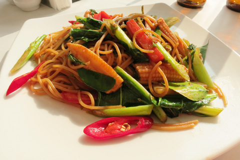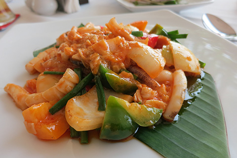 追加で注文したのはこれまたタイらしいフレイバーのスパゲッティーキマオタレーで唐辛子、バイマクルート、ショウガ(キン)、グリーンペッパーで味付けしたかなり個性的なシーフードスパゲッティ。