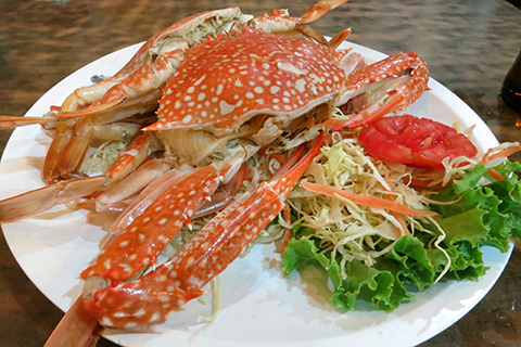 並んでいた素材からうちわ海老とプーマー(渡り蟹)を指示してうちわ海老はパオ(炭焼き)、プーマーはヌン(蒸し)にしてもらう。