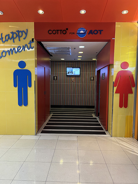 国内線用のAコンコースはガラガラでかつて山小屋も入っていたフードコートは改装中、トイレはやたらポップなカラーになっていた。