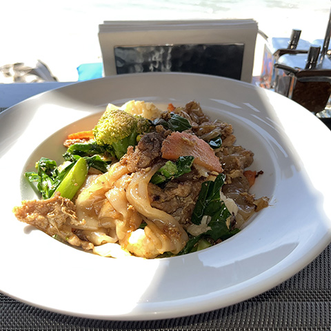 昼はホテルのレストランでパッシーイウムー(幅広麵のタイ醤油炒め)。