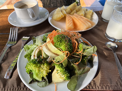 朝はサラダとフルーツ、ヨーグルトそれにコーヒー。サラダが納豆に置き換われば普段と変わらない朝食メニュー。