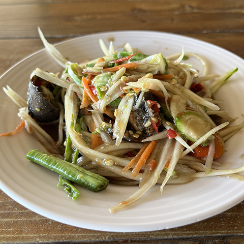 ソムタムパラーと、ビーチでしか食べることのないマカロニ炒め。