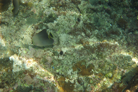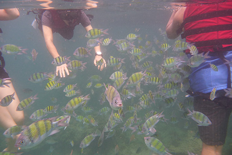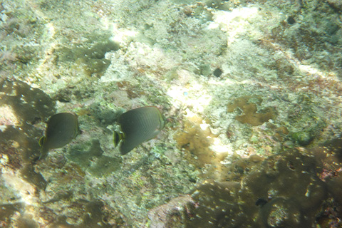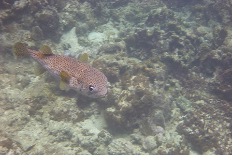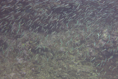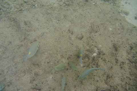 砂浜と反対側の岩場は透明度がかなり高くすごい数の小魚の群やゆっくり泳いでいる箱ふぐなどを見ることができた。