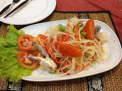 ソムタム・プーマーソット(生の渡り蟹いりソムタム)をつまみにウィスキーを飲みながら、15分くらい待たされてやっと出てきたそのホイワーンパオ。