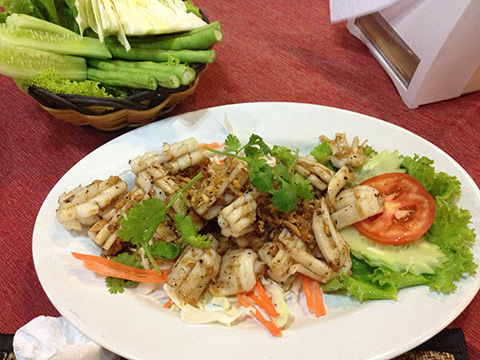 プラムックトートガティアム(イカのニンニク揚げ)、ソムタムプーマー、ブラックラベル2杯とで870THB。