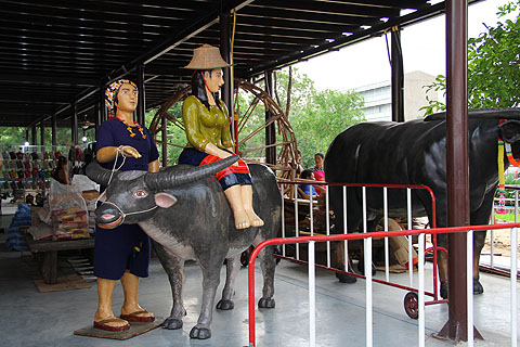 バムペンタイ側に戻ったところには男女と水牛の像が立っていたがこれがこのタラートの由来になったクワンとリアム(という悲恋映画があったようだ)なのかもしれないとあとになって知った。