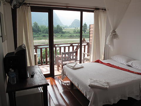 | 5/6-7 | ワンビエン | Elephant Crossing Hotel | 30USD | ☆☆☆☆★ | ![]() ここも目の前が川というロケーション。 一面がほとんどガラス窓になっていて明るく眺めがいい。 A/C、冷蔵庫、TV、ファン、ベランダ付き。 さすがロンプラお勧めだけあってコストパフォーマンスも抜群。 |