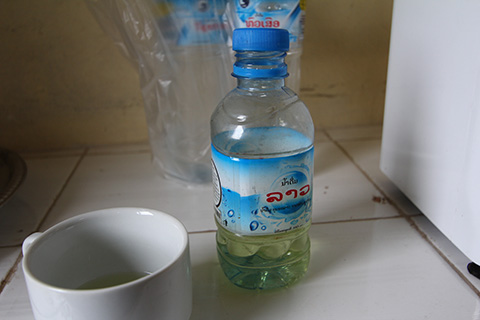 市場内の飲み物屋で1.5L入りペットボトルで売られているラオラーオを発見したがさすがにそれは飲みきれないし、かと言って持ち運ぶにも苦労するのでおばさんに「小さいのないの?」と頼んだら300ccくらいのペットボトルに入ったものが出てきた。