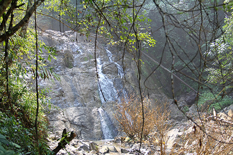 その先もまた滑りやすい岩の上を渡ったりして10分ほどで小さな砂防ダムに到着。