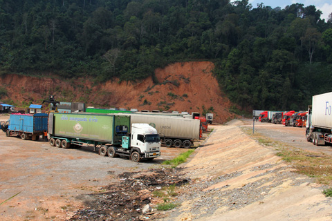 国境近くの大きな駐車場に中国からのトレーラーとタイのトレーラーが停車していた。