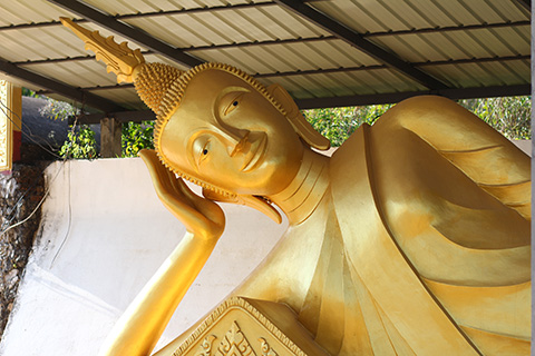 その裏にはタイともミャンマーとも表情の違うスリムな涅槃仏が横たわっていた。