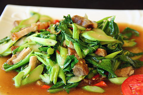 ビアラオを頼んだ後でパッカナー・ムークロープとスパゲッティ・キーマオ・タレーを注文。