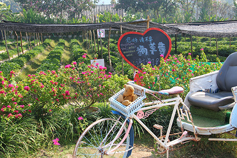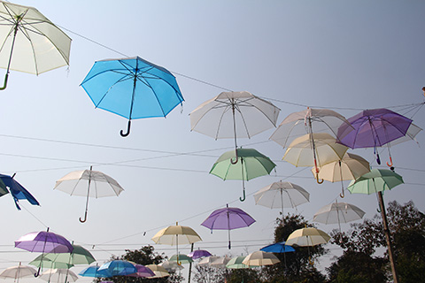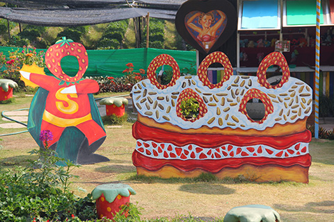 土産物屋や軽食コーナー、記念写真用の書き割り、空中に広げられた色とりどりの傘などがあり奥にはいちご畑があるようだった。