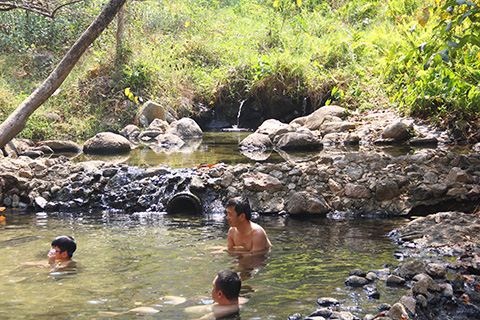 前回訪れた際は湯船を作り始めたところだったが、今やすっかり露天風呂が出来上がり、地元の中学生や中国人旅行者などが温泉を楽しんでいた。
