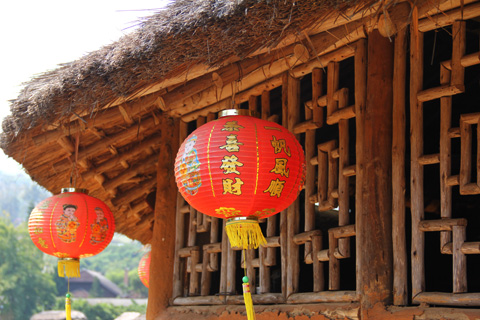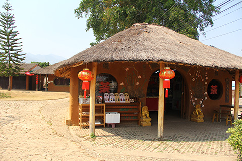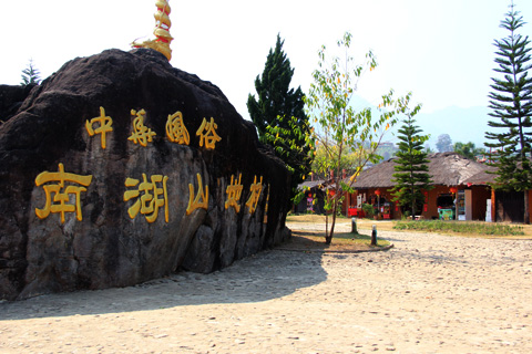赤い門をくぐった先の左側、大きな岩に中華風族 南湖山地村と彫られていた。