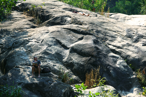 「滝の上に登るな」と英語でも書かれているにも関わらずデブファランたちが滝の上でトドのように横たわっていた。