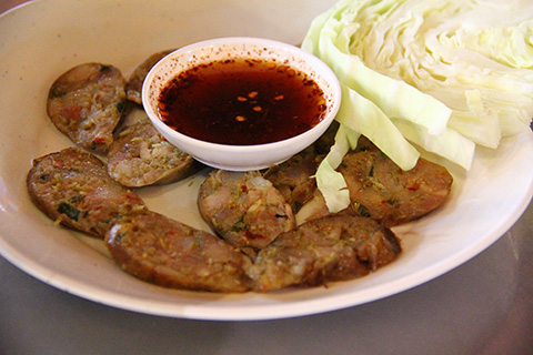 端っこの方の店でサイウアとカオソーイを注文しその隣でビアチャーンを1本。