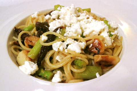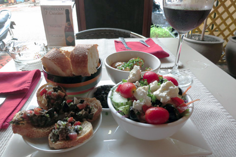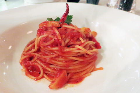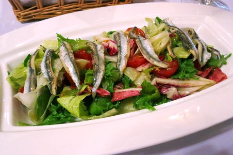 アンチョビーのサラダとアスパラとガーリックのトマトソーススパゲッティ、それに赤ワインのデキャフェ500mlを注文。
