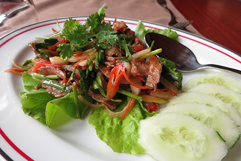 牛肉のサラダ、グラスワインとで170,000LAK。
