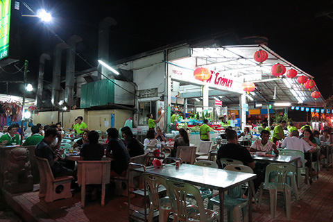 タラートのような店内では足りずに歩道の上まで広げた客席は7時にはほぼ満席。