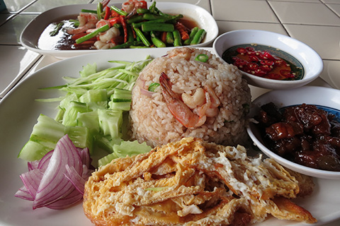 好物のカオグルックガピ(混ぜご飯)とアスパラ炒めを注文(255THB)。