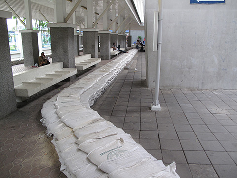 ところがBTSのサパーンタークシン駅を降りて見えてきたのは、土嚢は積まれているもののまだまだ溢れる気配のない運河。